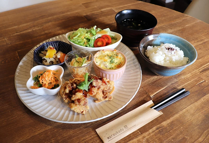 広島市佐伯区の住宅街に佇む「わらうかど庭」は、手作りにこだわった料理を1日中楽しめるカフェ&ダイニング。店名には「美味しいものをたらふく食べて、笑顔になってほしい」という想いが込められ、温かな雰囲気の店内は地域の人々に親しまれている。ランチタイムには、野菜たっぷりの「日替わりランチ」や「メインが選べるプレートランチ」が人気で、キッズ・ジュニア向けのメニューも充実。テイクアウト用のお弁当も大人・キッズ・ジュニア用の3種類があり、ご家族でのお出かけにも最適だ。夜には、旬の食材を使った「わらかどコース(予約制)」やプレートメニューが揃い、女子会や宴会、ご家族の集まりに対応。店内は明るく広々としており、テーブル席や4人用半個室、季節限定のテラス席もあり、ペット同伴も可能。さらに約8名まで利用できるレンタルスペースも備え、時間を気にせずゆったりと会話や食事を楽しめる、ご家族や友人と過ごすのにぴったりの癒やし空間となっている。