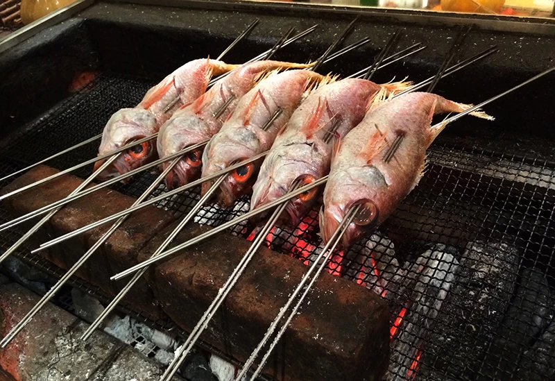 かつて瀬戸内海を束ねた海賊の豪快な食卓を体感できる「村上水軍」は、鮮度抜群の和食ディナーを堪能できる一軒です。船内をイメージした吹き抜けの空間には巨大ないけすが据えられ、全国から厳選された活魚が泳ぎます。名物の「活イカ」は山陰からの産地直送。透き通る身のコリコリとした食感と深い甘みが広がり、ゲソやミミはサクッと香ばしい天ぷらや塩焼きで二度味わえます。職人が活魚をさばく臨場感とともに、掘りごたつの個室で大人の夜を満喫できます。