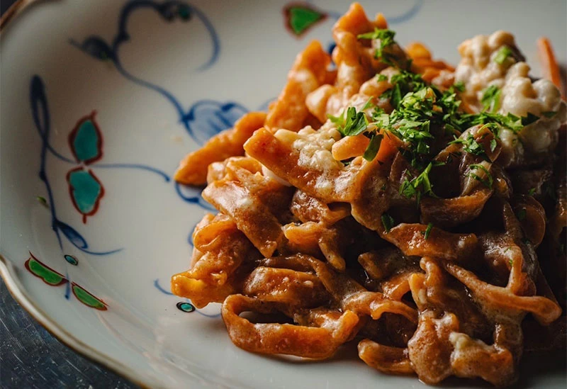 地元・広島をはじめ国内外から厳選した旬の食材を使い、伝統的なイタリア郷土料理へと昇華させる「Ristorante Carlotta」。中電前停留場から徒歩約7分、じぞう通りにひっそりと佇む隠れ家のようなリストランテです。ディナーは完全予約制で、素材の旨味が溢れる月替わりのコースを提供。