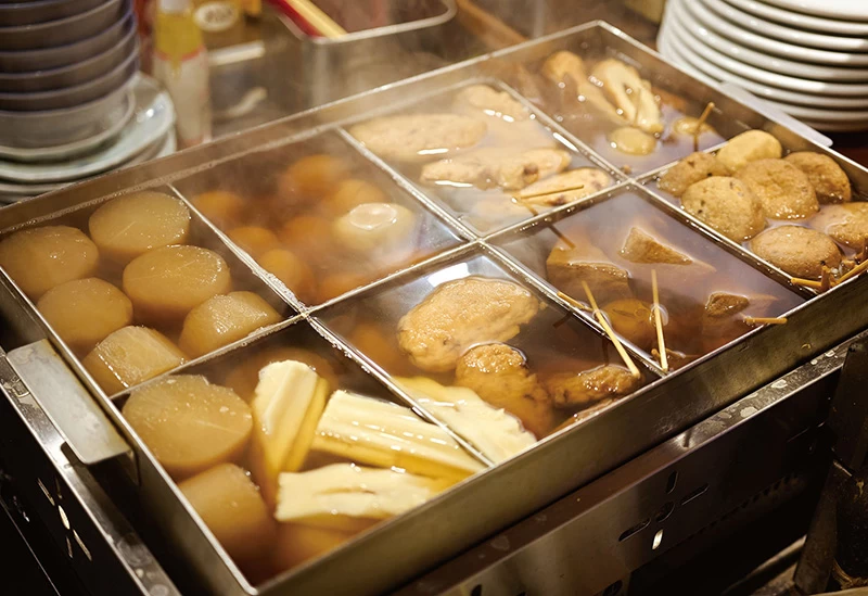 JR広島駅からすぐの大衆酒場は、気軽に立ち寄れる2軒目にもぴったりの場所です。名物の「日高昆布だしのおでん」は、大根やがんも、紅しょうがさつま揚げ、広島産牡蠣など種類豊富で、昆布の旨味がじんわり染みわたります。おでんダシで割った日本酒「八海山のダシ割り」もおすすめです。焼き鳥ややきとん串、広島カキフライなどおつまみも充実。昭和風のレトロな店内は活気にあふれ、仲間と楽しく過ごせる居心地の良い空間です。