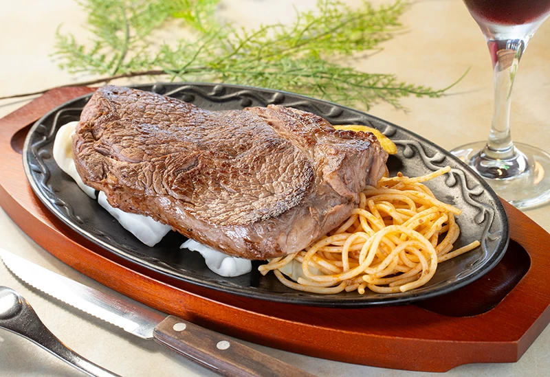 木の温もりが漂うログハウス風の空間でステーキランチもカフェタイムも楽しめる「やぽんすき」。長年続く人気店ならではの安心感があり、おすすめの「ハチハンステーキ」やハンバーグはしっかり満足感があります。ドリンクには「アイスコーヒー」を含むソフトドリンクが取り揃えられており、食事後に冷たい一杯でほっと一息つくことも。照明の柔らかな光と木のインテリアが映える店内では、“映える写真”も自然と撮りたくなる雰囲気です。食事にもカフェにも使いたい、万能な一軒としておすすめです。