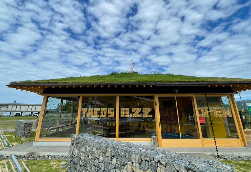 屋根の上が芝生になっている特徴的な外観が目を引く「TRANQUILO TACOS 父母ヶ浜店」。目の前に広がる父母ヶ浜の絶景を眺めながらメキシコ料理「タコス」が味わえます。日本人が食べやすいようにオーナーがアレンジした本格的なタコスで、「テリヤキチキン」「ソーセージ&ミンチ」など豊富な種類が揃っています。付属のハラペーニョソースで辛さを調節できるのも嬉しいポイント。秋からはスープなどの期間限定メニューも提供しているので、こちらもご堪能あれ。