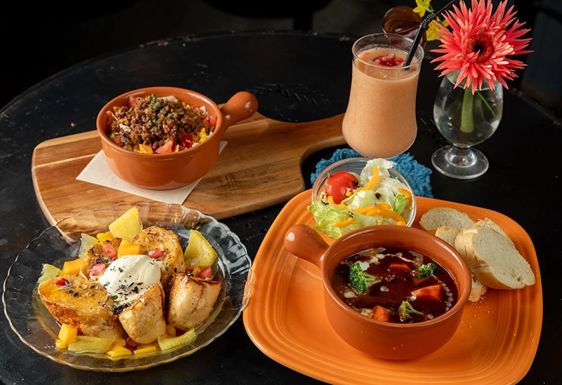 ランチメニューには「特製カレー」や「パスタ」、自家製パンを使用した「ハンバーガー」「ホットサンド」などのボリューム満点のメニューもご用意。全ランチメニューに「旬のカップフルーツ」や追加料金なしで選べる「フルーツ生ジュース」など、果物屋さんのカフェならではのラインナップとなっております。