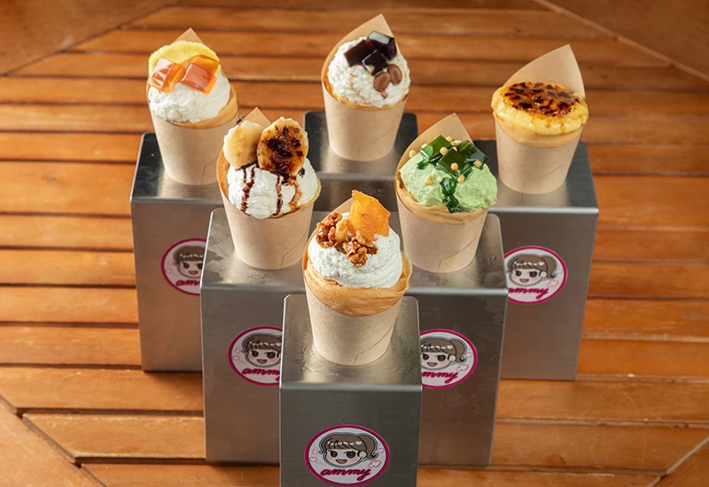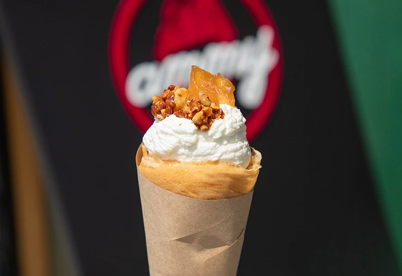 素材にこだわった自慢のクレープは、すべて店主の手作り。甘さ控えめでさっぱりとした生クリームには“苦手な人にも食べてほしい”という思いが込められ、最後まで飽きずに楽しめます。メニューは定番の「チョコバナナ」をはじめ、抹茶嫌いでも美味しいとうなる「抹茶」、ラム酒ゼリーとナッツが香ばしい「りんごとキャラメルナッツ」など多彩。四季を包むこだわりのフルーツクレープも人気で、春夏秋冬、その季節に最も美味しい果物を使っています。フルーツとクリームとのコントラストが際立ち、見た目の華やかさも魅力です。