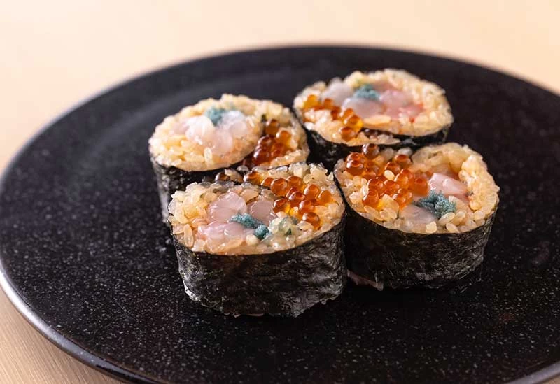 「鮨 髙森」は、石川県内の名店で長年修業を積んだ店主が営む完全予約制の寿司店です。遊び心を取り入れた“創作寿司に見えない創作寿司”が自慢で、店主のこだわりと工夫が感じられます。昼と夜のおまかせコースでは、小鉢や寿司、みそ汁などを中心に提供しています。店内は8席のみなので、北陸や金沢の味をじっくり味わえるのも魅力です。お店は築約100年の古民家を改装しており、掻き落とし技法で仕上げたグレー調のデザインと白い漆喰の壁が特徴。