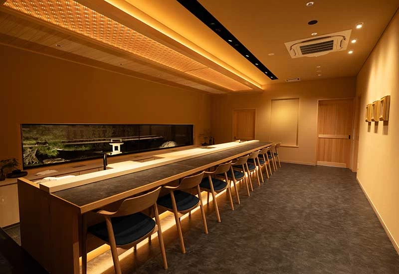 金沢市の閑静な住宅街に佇むこちらの寿司店は、味わいはもちろん、空間やもてなしに至るまで細やかな心配りが息づく一軒。入口にはやわらかな彩りの友禅パネルが設えられ、店内には檜の香りが心地よいカウンター席と、ゆったりと過ごせる個室が広がる。寿司は兄弟の職人が一貫一貫丁寧に握り、岡山の備前焼や石川の九谷焼など、選び抜かれた器がその美しさを引き立てる。夜にはライトアップされた庭が幻想的な景色を演出し、四季折々の表情も楽しめる。記念日や旅の特別なひと時にふさわしい、上質な時間が流れる寿司処だ。