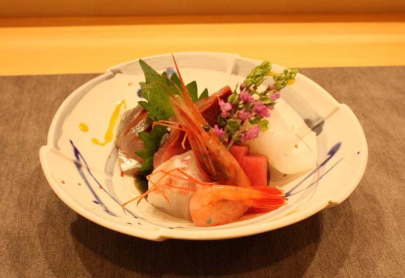 鮮魚店を営んでいた店主が割烹の修行を経てオープン。魚介は県内の漁港から直送、野菜も顔の見える地元生産者から仕入れるなど、こだわりが詰まった料理が揃います。なかでも金沢の新鮮な魚を味わえるのが、お造り盛り合わせ。金沢港や七尾港で水揚げされた地物の魚介を使用しています。内容は季節や仕入れ状況で変わるため、その時期の旬を堪能できますよ。