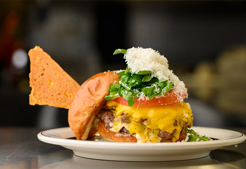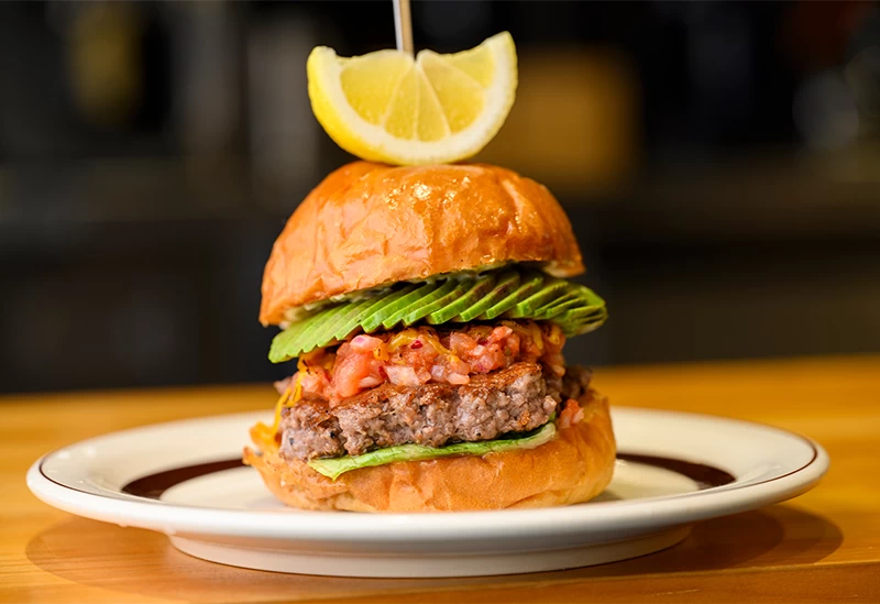 おひとり様から少人数、グループまで幅広く利用できるハンバーガー店。テーブル席やソファー席、さらにはペット同伴OKのテラス席まで、さまざまなシチュエーションでハンバーガーを楽しむことができます。牛肉本来の旨味が楽しめる宮崎県産牛100%パティは、小麦の香り豊かな特注バンズと相性抜群。粗挽きミンチとハンドチョップした異なる部位を絶妙な比率で配合し、スマッシュという技法で一気に焼き上げ旨味を凝縮。表面は香ばしくカリッと仕上げています。