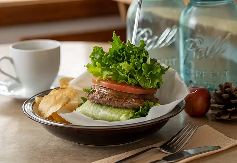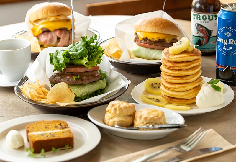 中軽井沢駅から徒歩約10分、緑豊かなエリアに佇むアーリーアメリカン調の一軒家カフェ。 春にはジューンベリー、秋には紅葉と、四季の自然に包まれたテラス席は特に人気。寒い季節には、シェーカースタイルの洗練された店内で、暖炉に癒やされながらのんびり過ごせます。名物は、思わず写真を撮りたくなる7段重ねのパンケーキ。地元食材を使ったジューシーなハンバーガーもおすすめです。ペット同伴OKで、愛犬と一緒に寛げるのも嬉しいポイント。ショーケースに並ぶスイーツはテイクアウトも可能です。