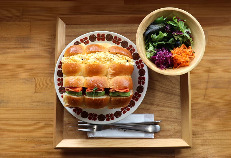 かつて郵便局として使われていた建物をリノベーションした、和と洋が調和する古民家カフェです。四季折々の植物や、テラスの池を泳ぐ金魚“らんちゅう”が出迎えてくれ、落ち着いた雰囲気の中でくつろげます。ローストビーフやハンバーグなどのメインに、パンまたはライスを選べる「スペシャルランチ」は、フルーツとスイーツの盛り合わせも付いて好評です。おすすめは、赤ワインや野菜、果汁を使った自家製ソースで仕上げたやわらかく上質なローストビーフ。コーヒーは季節や天候に応じて豆の配合を変え、抽出温度や時間にもこだわったオリジナルブレンドです。カップ&ソーサーは、オーナー夫妻が国内外で集めたコレクションから選ばれています。