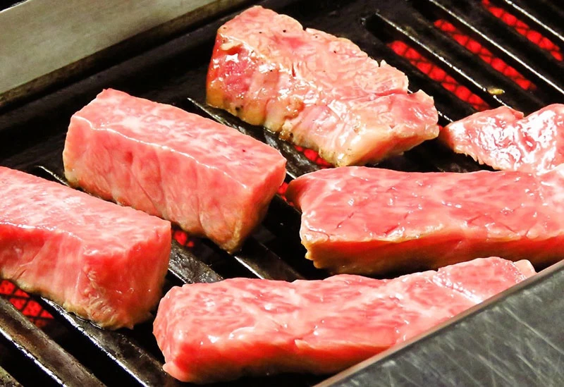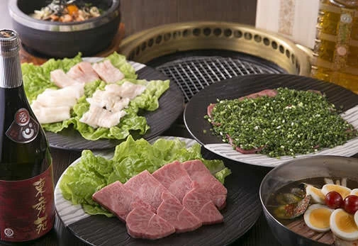 「備長炭焼肉 東秀苑(とうしゅうえん)」は、九州産の黒毛和牛をはじめ、品質にこだわったお肉を提供している焼肉店です。店内にはボックス席や掘りごたつ席が用意され、全席に備長炭を使った炭火焼コンロを完備。メニューは、希少部位のハラミやミスジ、赤身のサイコロステーキなど幅広く揃います。なかでも、ネギを落とさないように焼いて味わう厚切りのタンがおすすめです。サイドメニューには、キムチや冷麺といった韓国料理も並び、焼き肉以外の食事も堪能できます。