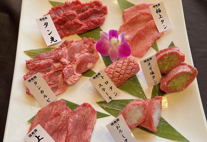 「順光苑 本店」は、店主が全国から目利きで選んだ希少部位や九州産黒毛和牛を味わえる焼肉店です。店内にはテーブル席と掘りごたつ席が用意され、仲間との団らんや女子会などさまざまなシーンで利用できます。メニューは、希少部位を含んだ盛り合わせや数量限定のタンなどを提供し、なかでもたっぷりのネギを挟んだタン塩が人気。コースでは焼き肉だけでなく、肉寿司やすき焼きも堪能でき、心ゆくまでお肉を味わえます。