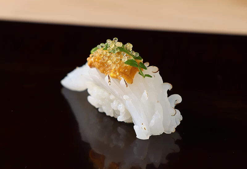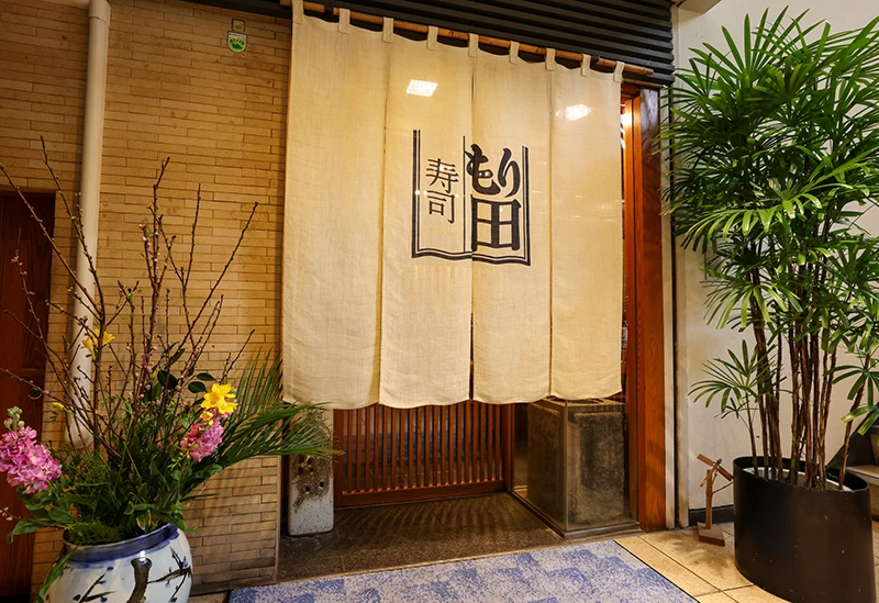「寿司もり田」は、柑橘類や塩を利かせてネタを引き立てる「小倉前寿司」を提供しているお店です。店内には8席のカウンター席のみを備え、目の前で寿司を握る職人の技を眺めながら料理を堪能できます。小倉前は、ネタに切れ目を入れたり、木の芽をあしらったりして、見た目を華やかに仕上げるのが特徴。メニューはランチ・ディナーともに「おまかせ」のみを用意し、北九州近海の魚介と旬を織りまぜた握りで、訪れるたびに新しい美味しさに出合えます。