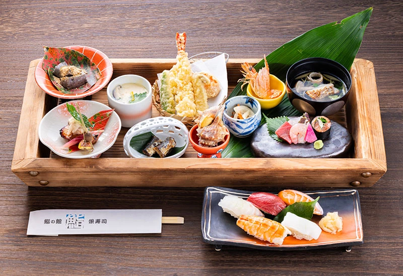 有明海・八代海・東シナ海に囲まれた天草の海の幸を中心に、九州近海から届く旬の活魚を生きたまま仕入れる「栄寿司」。職人が素材の持ち味を活かし、一貫一貫丁寧に握る寿司は格別だ。カウンター席では手さばきを間近に楽しめ、大きないけすを望むテーブル席や、日本庭園を眺める個室も用意。滝のせせらぎや季節の花木が織り成す景観が、上質なひと時を演出してくれる。