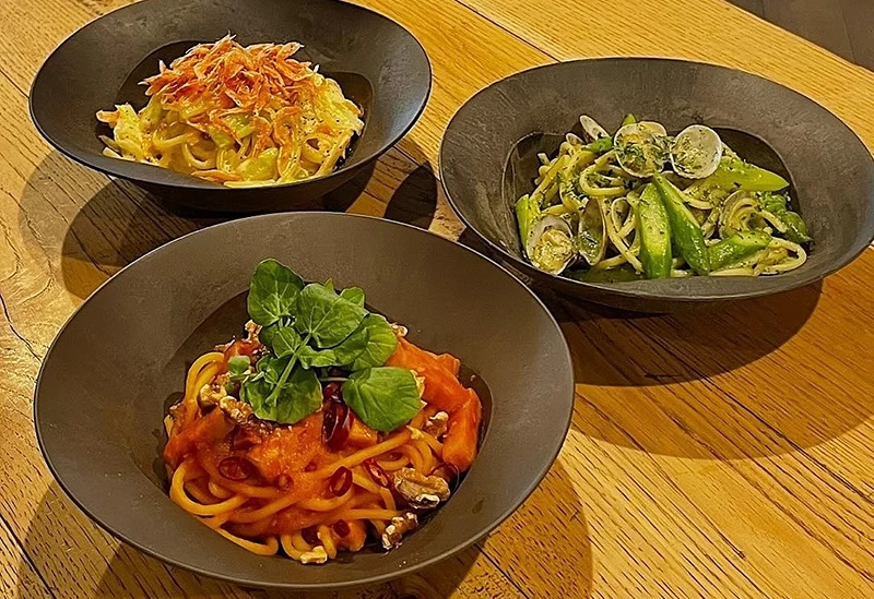 京阪宇治駅から徒歩約3分に位置する蕎麦屋「つばめ屋」では、地元・山城産の旬の野菜を使った天ぷらと、宇治抹茶を練り込んだ茶そばを味わえます。仕入れるそば粉は主に京都府産にこだわり、近郊の滋賀県産そば粉とブレンド。八割蕎麦、十割蕎麦、抹茶蕎麦の3種類があり、2種盛りや3種盛りで味比べも可能です。古民家をリフォームした木の温もりあふれる広々とした空間は、旅の途中にほっと一息つくのに最適。宇治抹茶の香りと味わいが引き立つ茶そばで、京都グルメを堪能しましょう。