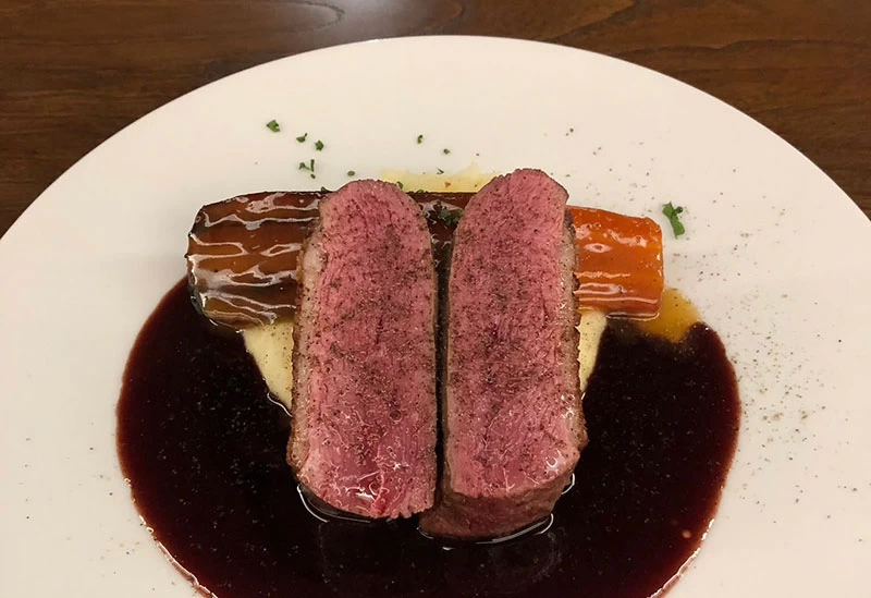 炭火で調理する黒毛和牛と丹波地方の食材を贅沢に味わえるお店。ランチには黒毛和牛のランチコース、ディナーには黒毛和牛の炭火焼きコースなどが味わえます。外観は和風、内観は和洋の融合が楽しめる空間で、赤色の橋が架かる中庭も印象的。金閣寺や北野天満宮など観光名所に近いので、観光途中にも立ち寄りやすいでしょう。