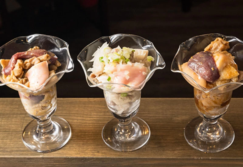 見た目も味も楽しい名物「ミックスホルモンパルフェ」
