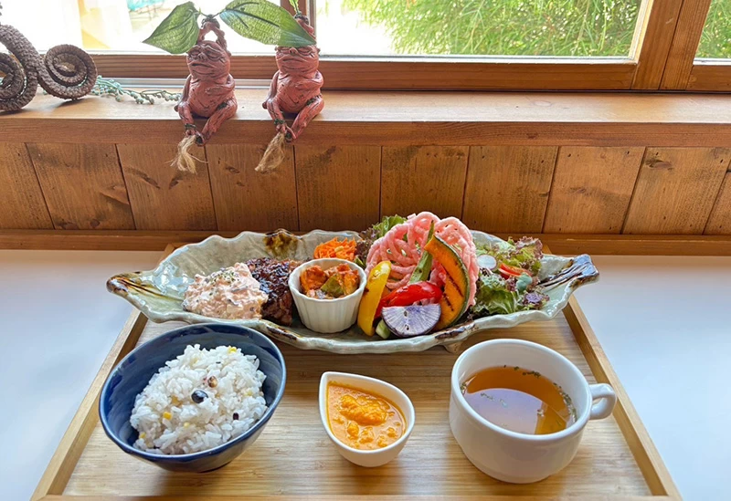 名物は多彩な和洋折衷料理を少しずつ盛り付けた「八菜ごはん」。バターチキン、マッサマン、パナンといった常時3種類のカレーも用意しています。予約限定の「よくばりメゾン」は、シュークリーム、チーズケーキ、おむすび、みたらし団子などを堪能できるよくばりな逸品。