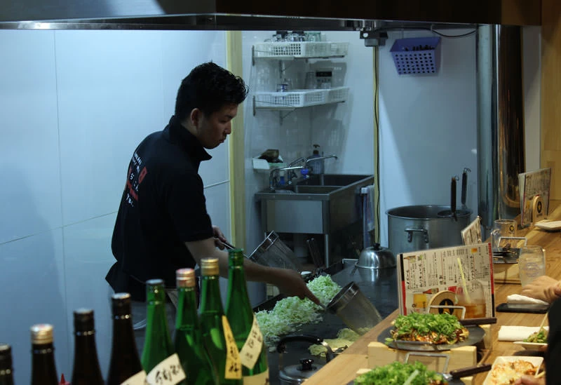 店主が目の前で焼き上げてくれる広島お好み焼き