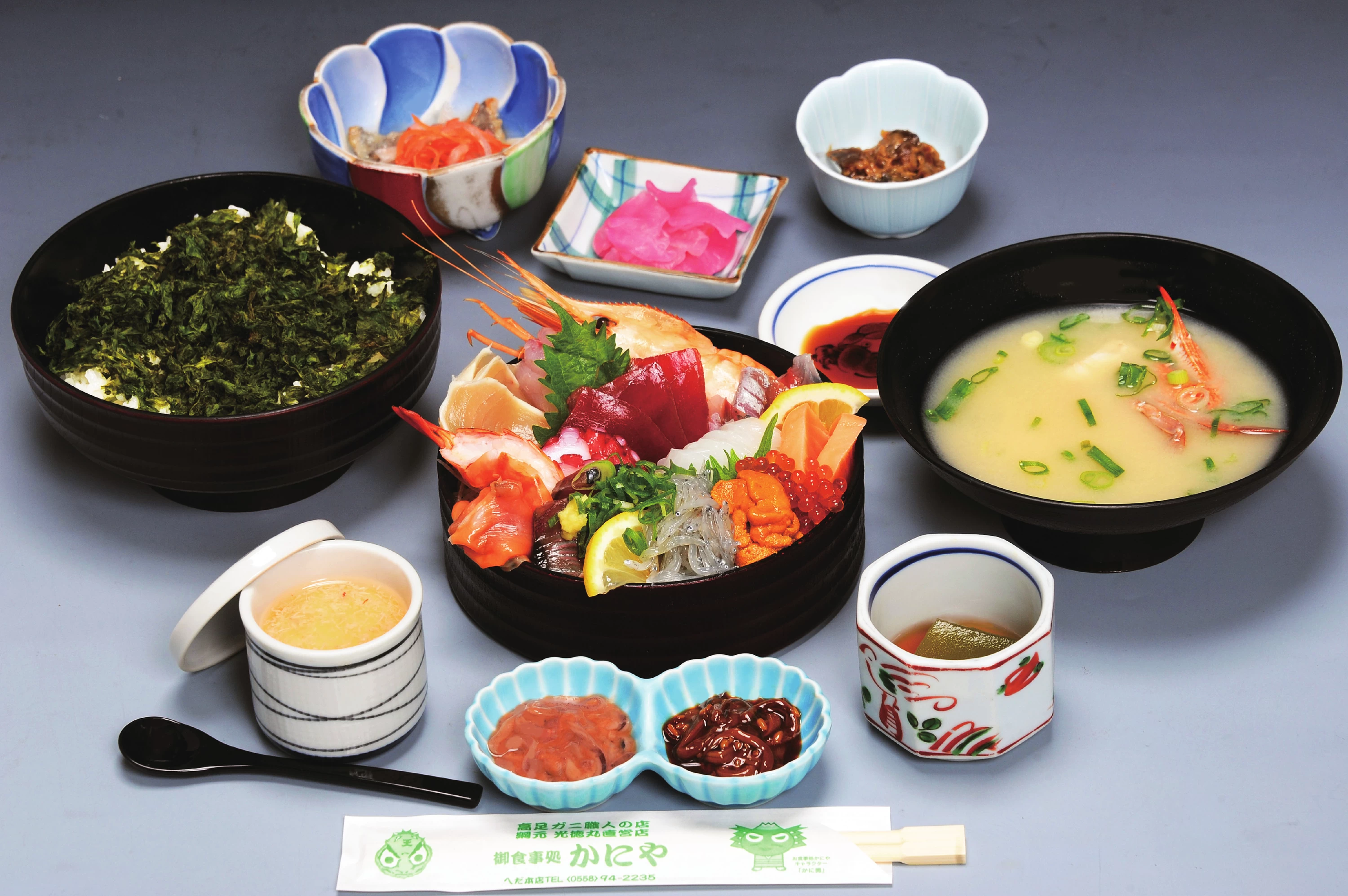 少し足を伸ばして訪れたい沼津市戸田(へだ)のグルメスポット。通し営業でランチにもディナーにも海鮮グルメを味わえます。市場を介していない新鮮なカニを、注文してから調理するため、鮮度が高いのが自慢! 世界最大「高足ガニ」のインパクトで会話が弾み、大きなカニを2人でシェアするのも貴重な思い出になるでしょう。