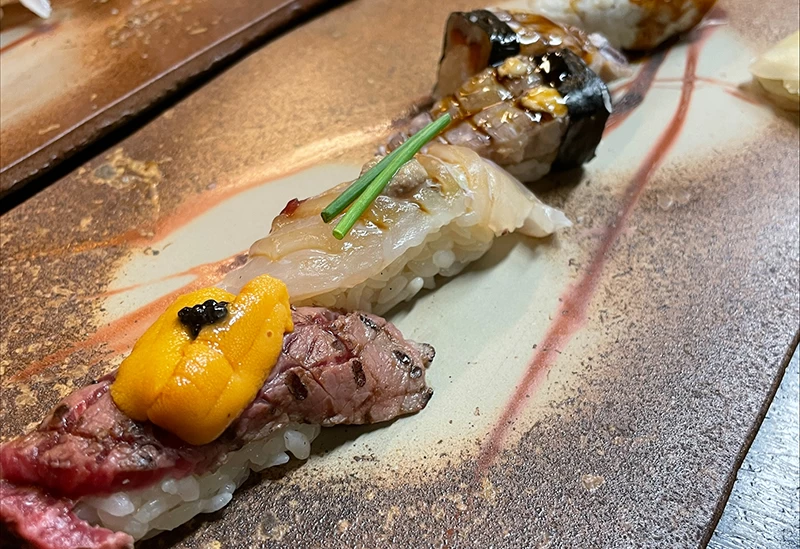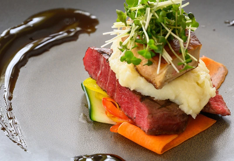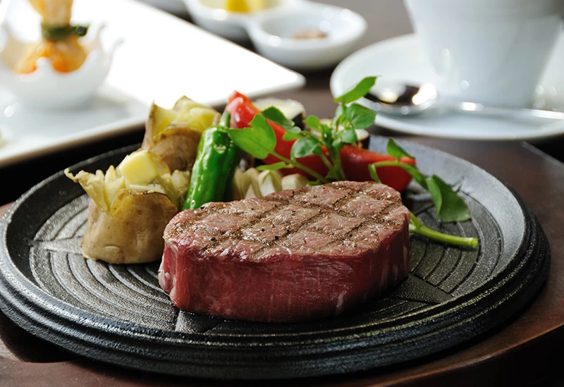 岡山県内でのランチで足を運んでほしいのが、和食と鉄板焼きを融合させた、ほかとは一線を画す名店。極上の和牛と瀬戸内の海の幸が、店主自らが選んだという美しい器に盛られて提供されます。和牛ステーキとお造りが一緒に楽しめるランチコースは、見た目も優雅で贅沢そのもの。店内は和モダンな落ち着いた設えになっており、上質な空間がより一層特別な時間を演出してくれます。