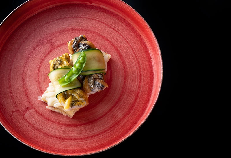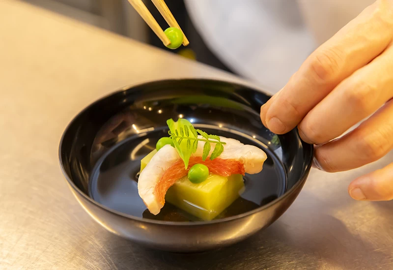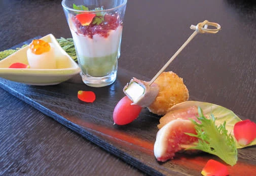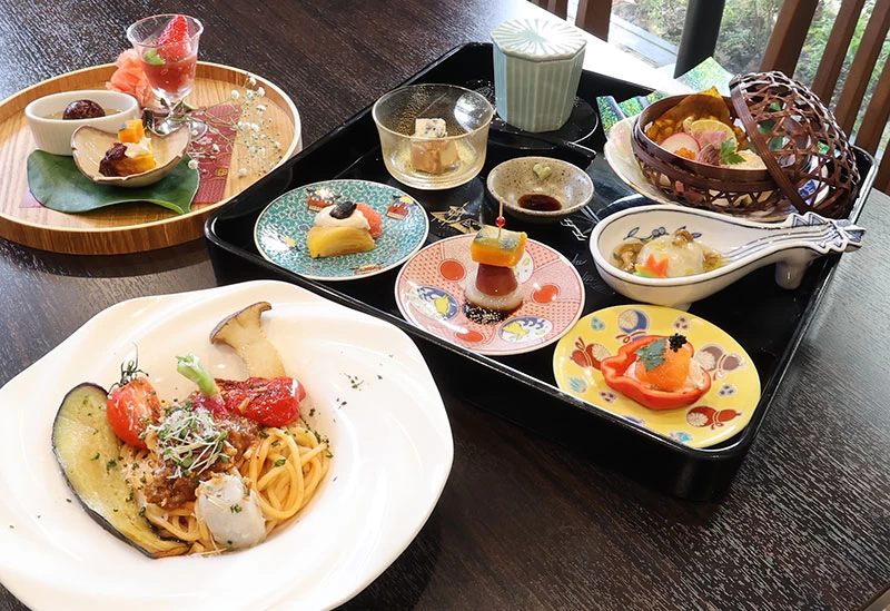イタリア料理の華やかさと和の優雅さを同時に味わえる唯一無二のお店です。新鮮な野菜や瀬戸内の魚介を使用したランチコースは、前菜にお寿司、メインにパスタがいただけるめずらしいメニュー構成となっています。30年間、和食の現場で経験を積んだ料理長が、和食にイタリアンの風を吹き込んだ創作料理はここでしか味わえない逸品ばかり。着物をリメイクして作ったランチョンマットや美しい食器も必見です。