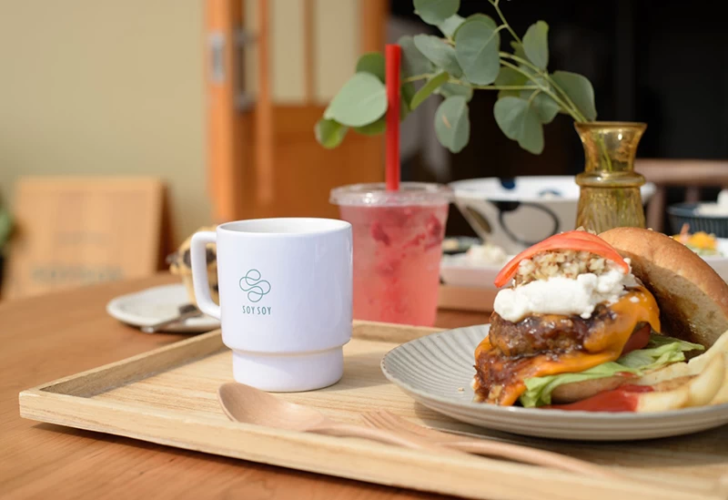 提供されるハンバーガーには、沖縄県産の和牛を使用したジューシーなパティや、自家製の和風「KINARIソース」、島豆腐・梅・シソといった地元食材がふんだんに使われており、バンズはオーダーごとに焼き上げられ、外はサクサク、中はもっちりとした食感が楽しめます。中でも注目は、ネギ油で香ばしさを引き立てた焼きネギとスライス和牛ロースを豪快に挟んだ「県産和牛のスキヤキバーガー」。卵黄がとろりと絡む、イートイン限定の人気メニューです。期間限定商品もあり、テイクアウトにも対応しています。