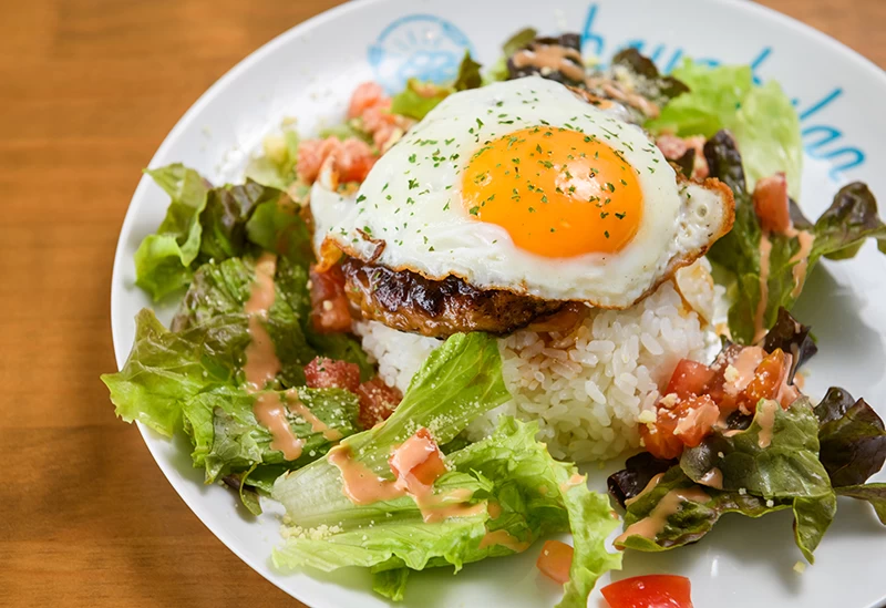 ハワイアンテイストのオリジナル料理には島野菜がふんだんに使われていて、どれも好評。16時までのランチタイムでは、パインさんぴん茶やシークワーサーと島野菜のミックスジュースなどが飲み放題です。パーティーにも対応しており、目の前のビーチにあるステージでは、ミュージシャンによるライブが定期的に開催されています。