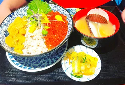 北海道札幌市・二条市場で朝6時から開店している「でめきん」。毎朝、小樽市と根室市の市場から仕入れた魚をその日のうちに楽しめる鮮度抜群の海鮮料理が自慢です。鮭ハラスなどの干物は店で一夜干し、イクラ醤油漬けも自家製。ウニ・カニ・イクラ・甘エビなどを贅沢に乗せた「プレミアムでめきん丼」は、新鮮な北海道の名物食材を一度に味わえる人気メニューで、すべての丼、定食に付く天然ダシの味噌汁も好評です。木の温かみが感じられる店内には、カウンターのほかテーブル席・ボックス席や個室があり、子ども連れのランチから大人数の会食まで対応しています。