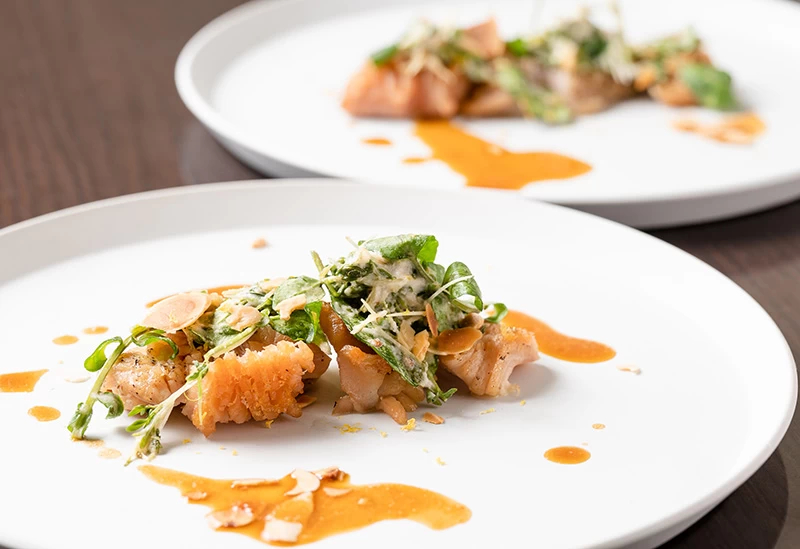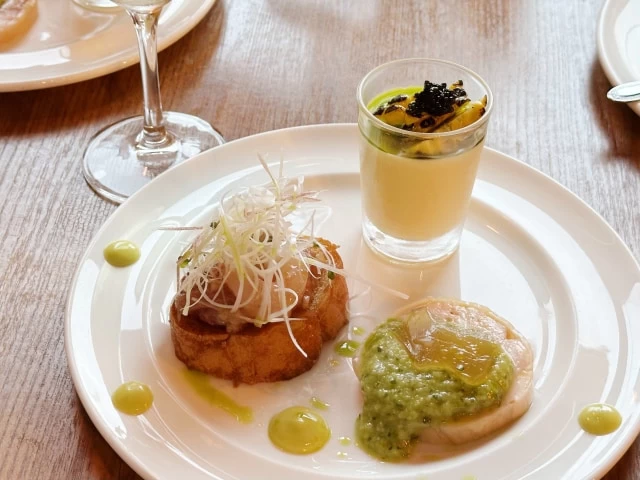 人気メニューの「黒毛和牛のロースト パセリのピュレ」は、外側は香ばしくしっかりと、中は柔わらかくレアに、グラデーションを出すように焼き上げており、肉のしっとり感がたまりません。パセリとスパイスを混ぜたピュレで、あっさりと召し上がれます。旬の味覚を堪能できるディナーコースもおすすめ。