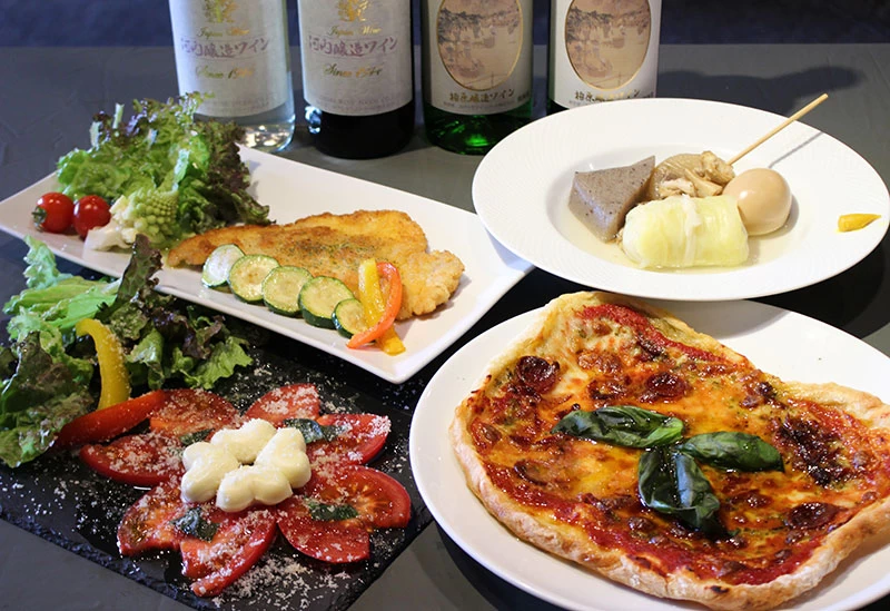 表面はカリッ、中はふんわりとした食感のお店で焼き上げる自家製「窯焼きPIZZA」や、旨味たっぷりのダシが染み込んだ「おでん」、色鮮やかな「幸せを運ぶカプレーゼ」など人気メニューが目白押し。その日によって内容が変わる日替わりのお惣菜もご用意しています。料理によく合うワインも、豊富に取り揃えていますよ。