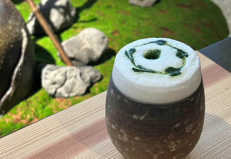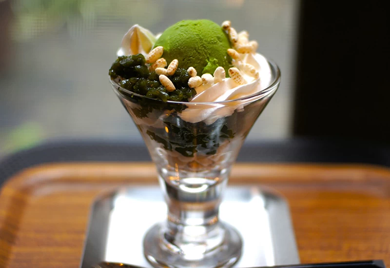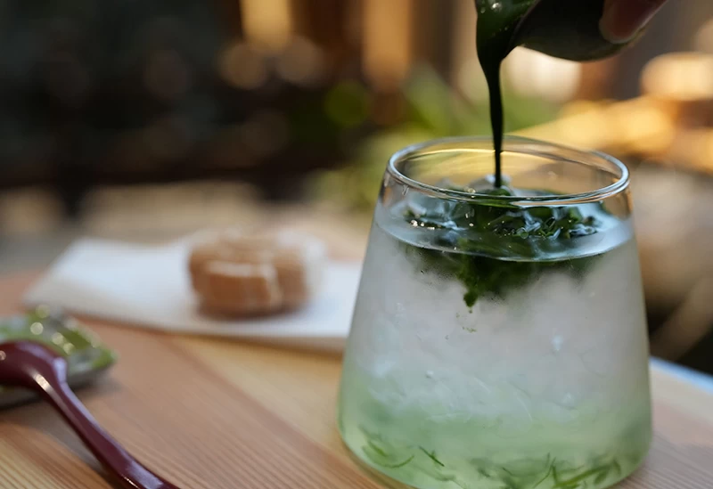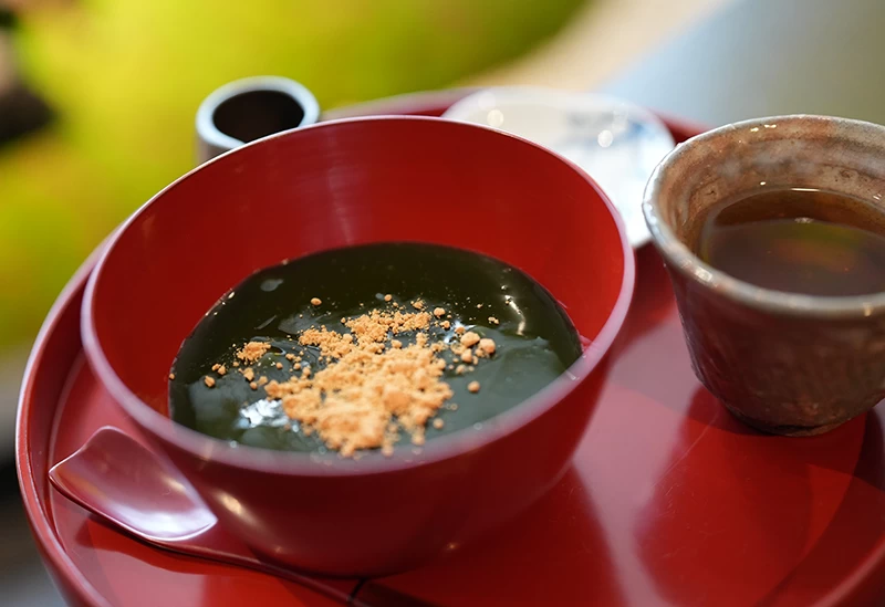 さらに、茶室に入る前に小さな日本庭園を眺めながら心を整える「腰掛け待合」の空間も魅力。喧騒を離れ、茶の香りと和の静けさに包まれる特別な時間が過ごせます。わらび餅やかき氷など、こだわりの甘味もどうぞ。