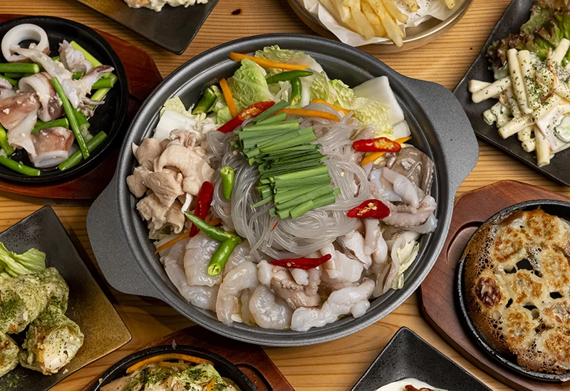 韓国屋台風のレトロな雰囲気が心地よい居酒屋。ランチにはラーメンや海鮮チャンポン、ディナーにはポテトサラダや鉄板餃子といったおなじみの居酒屋メニューを提供しています。おすすめは、イイダコとホルモン、エビが入った鍋メニュー「チュッコプセ」。マッコリやチャミスルとの相性も抜群で、お酒も進みます。カーテンを閉めれば半個室になる席もあり、気の置けない仲間との利用にぴったりです。