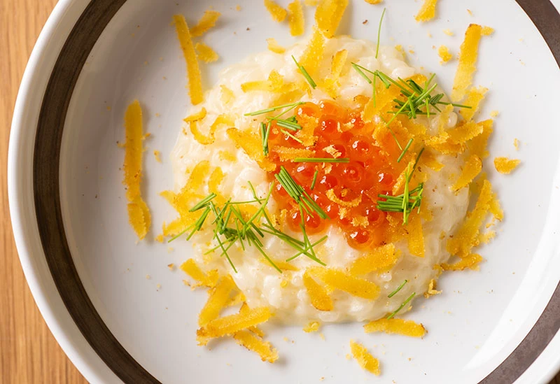 国産食材とイタリアンの見事な融合に出合えるレストラン。日本の四季を彷彿とさせる色鮮やかなメニューの数々が、五感を心地よく刺激します。使用する食材には強いこだわりがあり、なかでも牛肉は、脂のとける温度が低くさらっとしていて味が良いことから、石垣島で肥育された「美崎牛(みさきぎゅう)」を仕入れているそう。また、料理を引き立てるような色合いを意識した内装も魅力。カウンターやテーブル席のほか日本画が飾られた個室もあり、落ち着いた空間で、大切な人との食事をゆっくりと堪能できます。