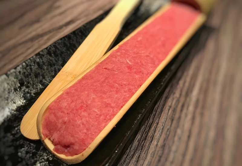 すすきのエリアに佇む焼肉店。重厚感のある木調のレトロな空間に赤いダクトが映える洗練された雰囲気のなかで、ゆっくりと食事を楽しめます。看板メニューの「ジンギスカン」は、脂が少なくくさみのない赤身肉を使用し、生でも味わえるほどの鮮度が自慢。さっと炙ってレアの状態でいただくもよし、卵黄と合わせてユッケ風にするのもおすすめです。