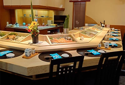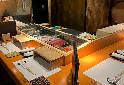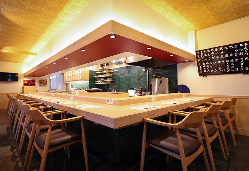 和モダンで落ち着いた店内には、職人の手さばきを間近で楽しめるカウンター席や、着物の帯柄を飾った半個室のテーブル席を完備。カウンター奥には小径木の年輪が敷き詰められ、やわらかな照明が心地よい空間を演出します。おひとり様での贅沢なひと時から、仲間との語らいまで、幅広いシーンでゆったりと寛げます。