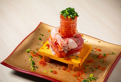 夜の人気メニュー「いくらのこぼれしだれ寿司」は、マグロ・ハマチ・サーモン・タイなど魚介をふんだんに使ったボリューム満点の逸品。筒をゆっくり外すとイクラがこぼれる瞬間は、思わずカメラを向けたくなる名物グルメです。見た目も味も大満足の贅沢なひと時を楽しめます。
