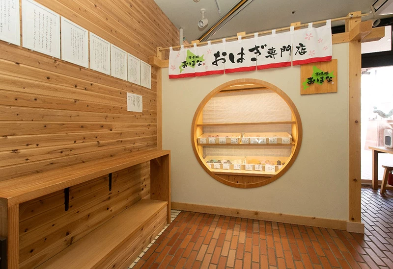 「おむすび茶屋 おはな」では、注文を受けてから握る出来たておにぎりと、北海道産の素材を使った手作りおはぎを楽しめます。お米は滝川市産「ななつぼし」を使用し、「塩」「梅」「しゃけ」などの定番に加え、「山わさび」など北海道らしい具材を含む約15種類を用意。のりは香ばしい焼きのりと磯の香りが感じられる生のりから選べるのも魅力です。十勝産小豆を使った甘さ控えめのおはぎは小ぶりで見た目も可愛らしく、手土産にもぴったり。味だけでなく見た目も楽しめる進化系おはぎです。