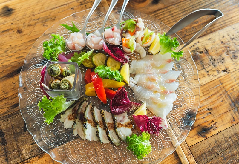 地元の食材を使った料理を定食やビュッフェで味わう