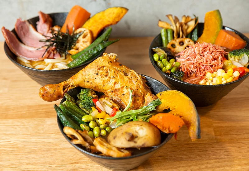 2024(令和6)年、豊島区の大塚エリアにオープンしたスープカレーの専門店。店内は、コンクリート打ちっぱなしのスタイリッシュな内装になっており、都会的な雰囲気です。野菜をたっぷりと使ったスープカレーが自慢で、辛さやトッピングなどは自由にアレンジ可能。基本のスープも5種類から選べるうえ、味変(あじへん)用スパイスも多数揃うため、何度も訪れたくなる魅力があります。