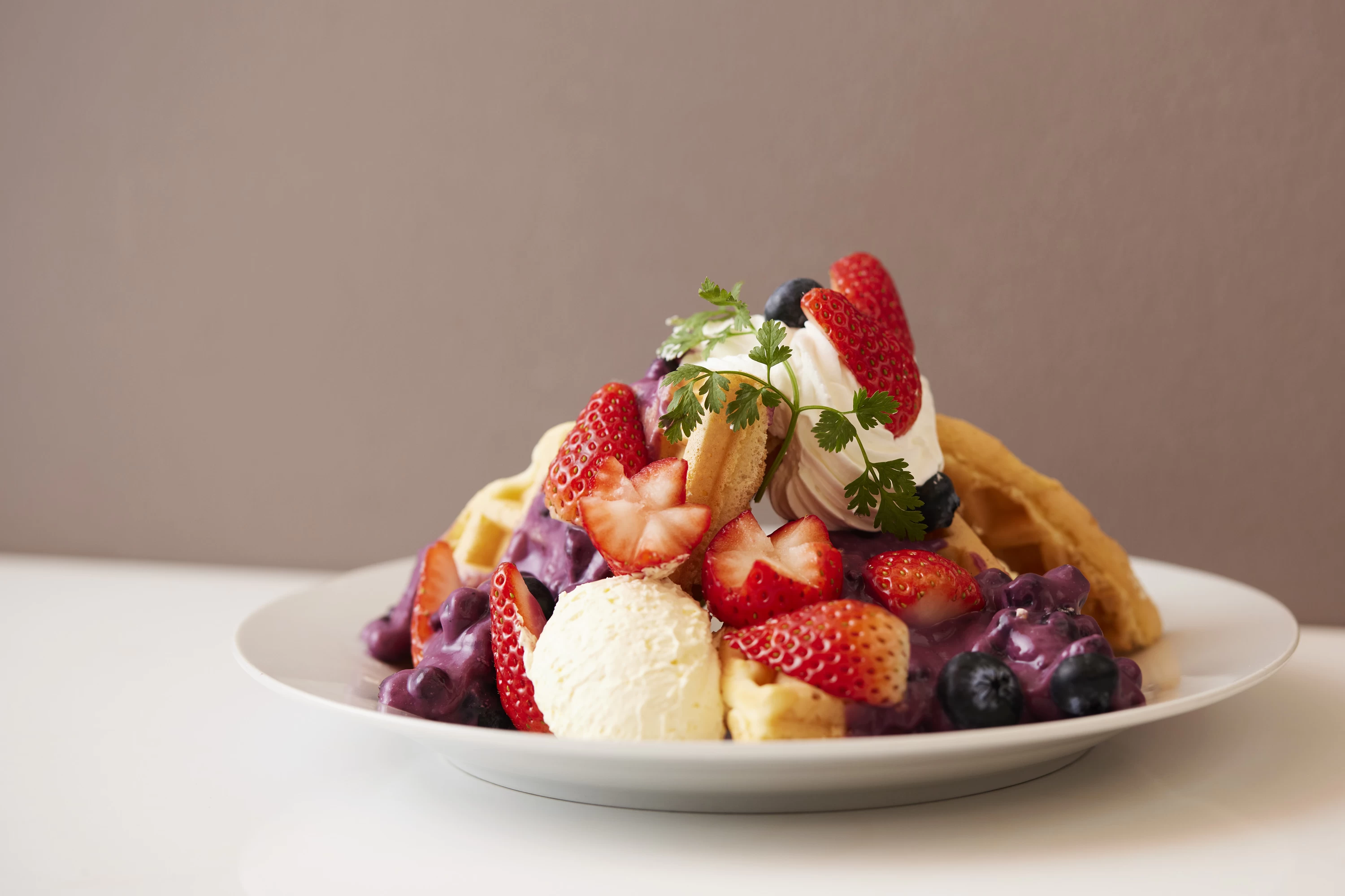 甘いものを味わいたい気分の時は、パフェやワッフル、軽食などのオーダーバイキングを楽しめるこちらのお店がおすすめです。フルーツや生クリームが贅沢に盛りつけられたパフェやワッフルは、SNS映え抜群! ビーフシチューやオムライス、もちもち食感の生パスタなどの一品料理も用意されているため、ランチやディナーとしても利用できます。料理は注文を受けてから作られるため、いつでも出来たてをいただけるのも嬉しいポイントです。
