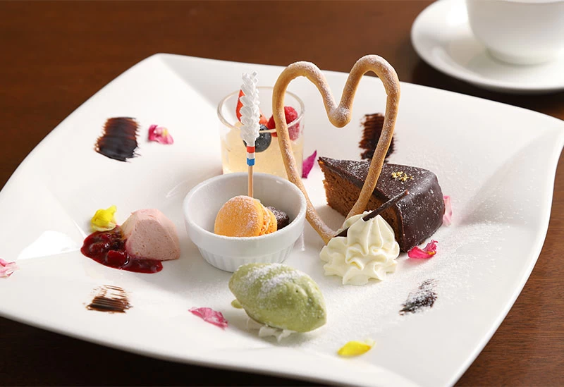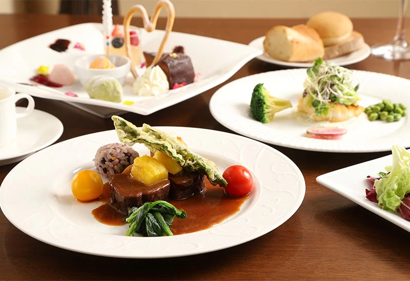 ホテル ブリランテ武蔵野内にあるフレンチレストラン「ル・ソレイユ・ルヴァン」は、アジアンテイストとモダンが融合した洗練された空間が魅力です。地産地消にこだわり、埼玉県産の季節野菜やさまざまな食材を使った料理を、ランチで提供しています。また、スイーツにも力を入れており、見た目にも華やかなデザートプレートは、ケーキやムース、ゼリー、アイスクリーム、季節の果物などを少しずつ盛り合わせた贅沢な内容。盛り付けにも工夫が凝らされており、目でも舌でも楽しめるのがうれしいポイントです。