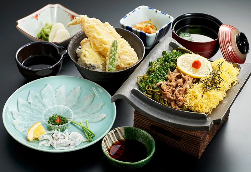 唐戸市場から仕入れた新鮮な魚介類を提供。山口グルメの代表ともいえるフグを唐揚げや天ぷら、にぎり、刺身など、さまざまな調理法でいただけます。そのほかにも、下関名物の瓦そばや上質な味わいが楽しめる長州鶏の逸品料理など、バラエティ豊か。地酒やワインとともに、山口グルメを余すことなく堪能できます。ランチだけでなく、日没後にライトアップされた関門橋を眺めながらのディナーの利用もおすすめです。