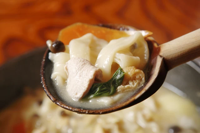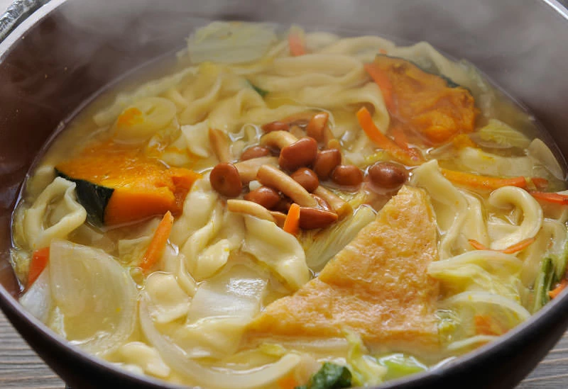 小麦粉を水でこねて平たい麺に伸ばし、かぼちゃや根菜、きのこ、店によっては肉などと一緒に味噌仕立ての汁で煮込む、山梨の郷土料理です。打ち粉を付けたまま煮込むため汁にとろみが出るのが特徴で、鉄鍋で一人前ずつ出す店も多く見られます。通年で味わえますが、寒い季節はとくに人気です。生地に塩をほとんど用いない製法のため、一般的なうどんとは食感や仕立てが異なります。