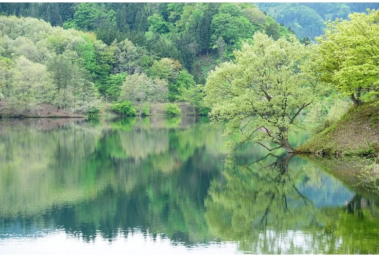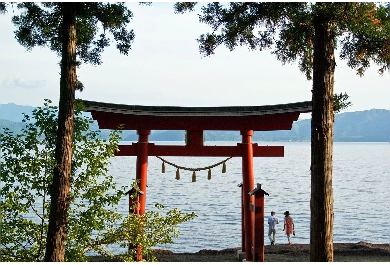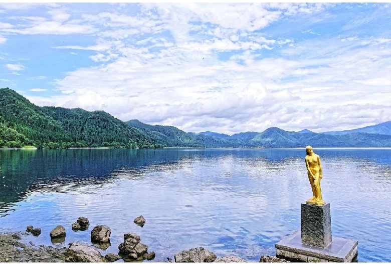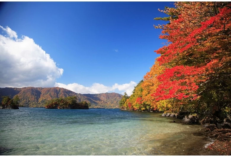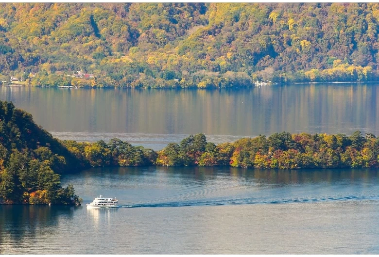 「田沢湖」は瑠璃色の湖面が広がる、日本でも有数の水深の湖です。湖は山々に囲まれており、時間帯による空の色を映し出した湖面や、四季折々に移り変わる眺望を楽しめます。湖を約40分かけて一周する遊覧船もあり、船上からの景色を眺めるのもおすすめ。紅葉ピークは例年10月下旬から11月上旬にあたり、湖面に映る鮮やかな山を見ようと多くの人でにぎわいます。