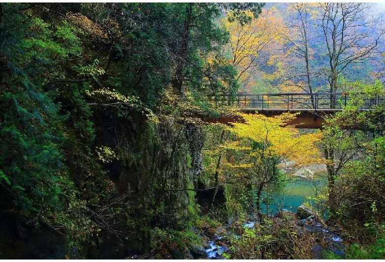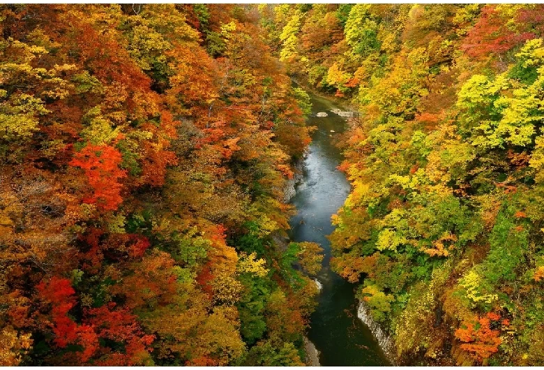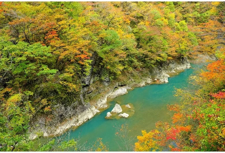 「抱返り渓谷(だきがえりけいこく)」は東北の耶馬溪といわれ、両岸の原生林と独特の青い渓流が美しい紅葉の名所です。川沿いには約1.5kmの遊歩道が整備され、奇岩や急流、大小の滝などさまざまな景色を見られます。なかでも、赤色の吊り橋とエメラルドグリーンの水面が作り出す情景は必見。紅葉の見頃となる10月上旬から11月上旬の時期には、芸能披露や茶席などが催されます。