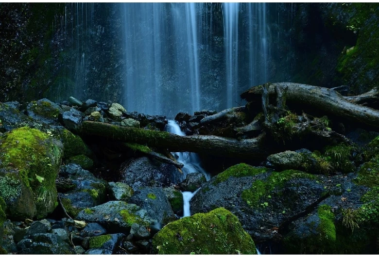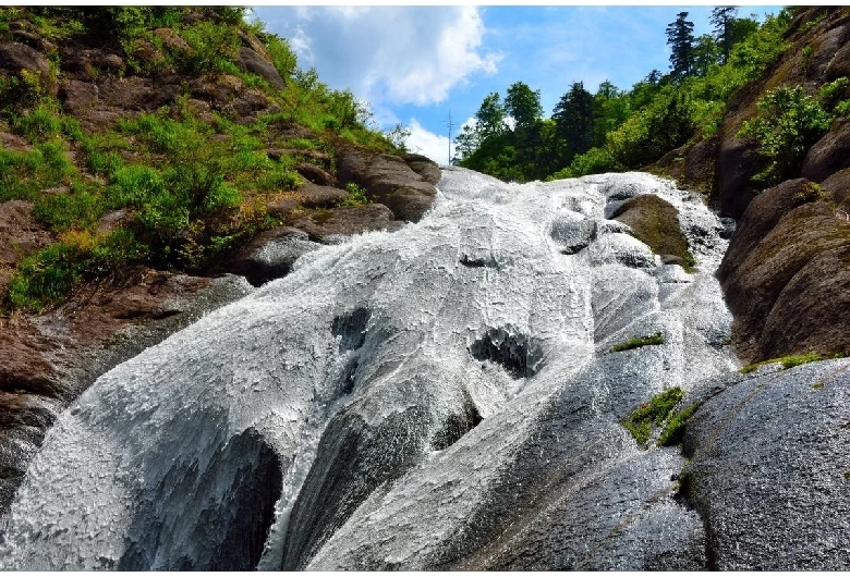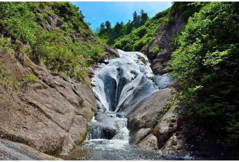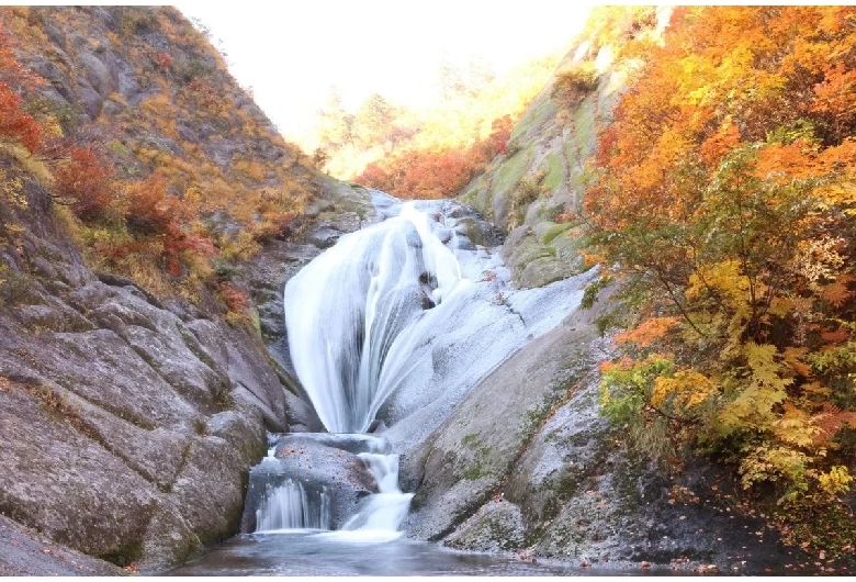 「桃洞滝(とうどうのたき)」は、なだらかなU字型の渓谷に大小さまざまな甌穴(おうけつ)と滝が点在するエリアです。桃洞滝は「女滝」ともいわれ、安産や子宝、縁結の滝としても親しまれています。周辺には遊歩道が整備され、10月中旬から下旬にかけては渓谷沿いの紅葉を眺めながらの散策が人気。周辺には野鳥が生息しているため、気配を感じながら森林浴を満喫しましょう。