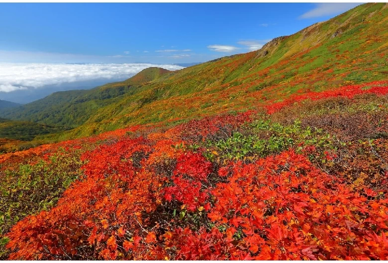 「駒ヶ岳(秋田県)」は標高1,600mを超え、数百種の高山植物が群生する活火山です。8合目までは自動車で移動でき(マイカー規制あり)、そこから山頂までは徒歩で登ることが可能。山頂からは、鳥海山や岩手山などの雄大な山並みと、日本でも有数の水深を誇る田沢湖の360度パノラマを堪能できます。なお、紅葉は例年9月下旬から10月上旬にピークを迎えます。このスポットには、「ムーミン谷」の愛称で親しまれている小路があり、木道の両側に紅葉が広がる様子は必見です。