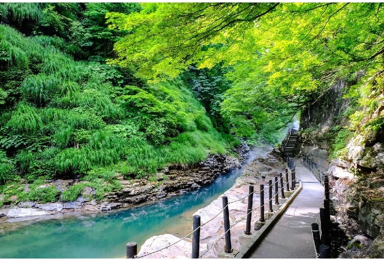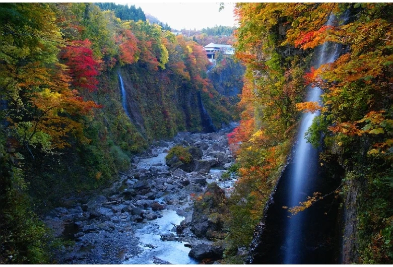 「小安峡(おやすきょう)」は、皆瀬川の急流が長年にわたり浸食して出来た渓谷です。渓谷周辺にある大噴湯では、岩間から約100度の熱湯と蒸気が音を立てながら激しく噴出している光景が見られます。周辺には遊歩道が整備され、自然を堪能しながら散策し、心身をリフレッシュするのがおすすめ。紅葉の見頃は例年10月中旬から11月上旬にかけて迎え、多くの観光客がカメラを持って訪れます。