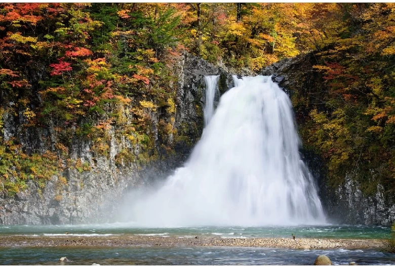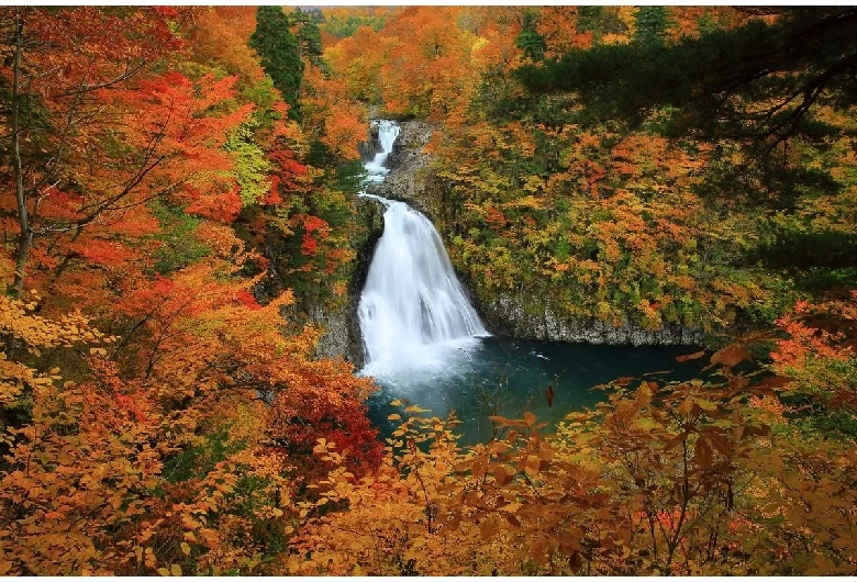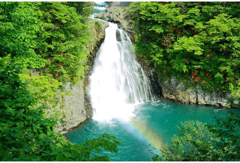 「法体の滝(ほったいのたき)」は、鳥海山の雪解け水が落差約60mを流れ落ちる大きな滝です。「日本の滝百選」にも選出されており、国内ではめずらしく山頂方向に向かって水が落ちている点が特徴。上流部にはトレッキングコースが整備され、玉田渓谷や甌穴(おうけつ)などの見どころを多数有しています。毎年10月下旬には歌謡ショーや抽選会が催される紅葉まつりが行われるため、木々を見ながら楽しいひと時を過ごしましょう。